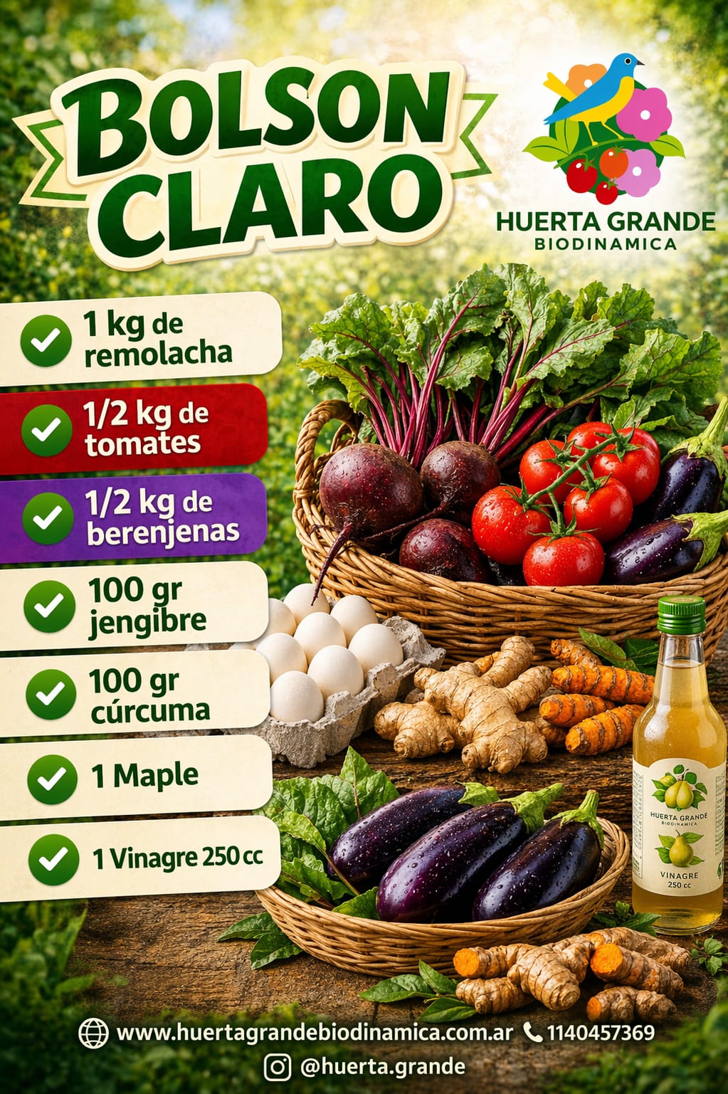 Bolson claro : 1kg remolacha, 1/2kg tomates, 1/2kg berenjenas, 100g jenjibre, 100g curcuma, 1 maple gallinas pastoriles y agroecologicas, 1 vinagre organico 250cc